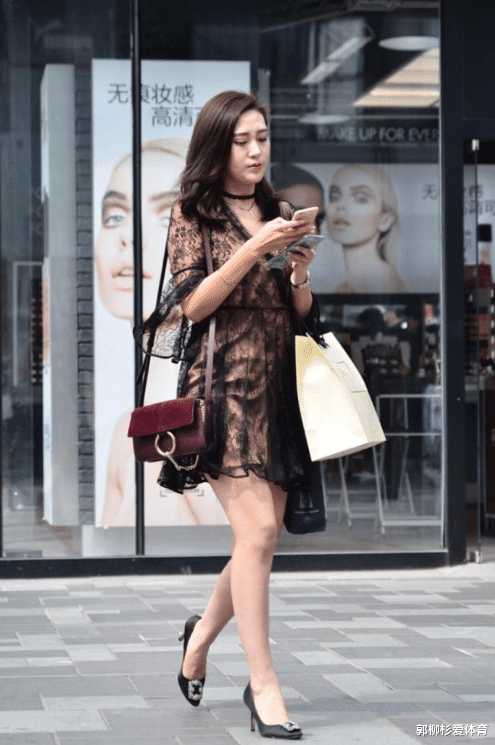 这个少妇也是结了婚也不安分,这种这么吸引眼球的穿搭也给安排上了,肉色打底的衣服,外面是一层蕾丝的薄纱,看起来就像是只穿了一件薄纱一样,非常的引人注目,收腰的设计还是有这么一点作用的,让整体看起来比较有气质,不会一直飘散在外面,而且黑色本来就是神秘的代表色。