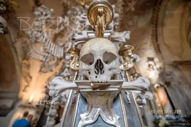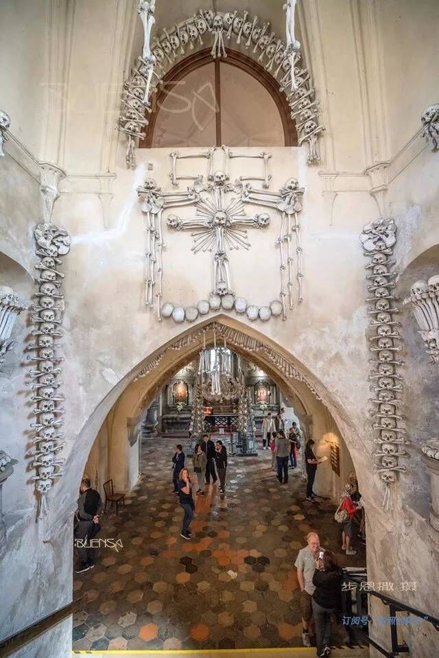捷克人骨教堂(Kostelík Vech savtych a kostnicí),位于布拉格以东约70公里的小镇Kutna Hora,建于14世纪,其外表是看似十分普通的哥特式建筑造型,但内部的装饰却都是用人骨做成的。教堂入口处有用120多块人骨做成的蜡台,天花板上铺的是四肢骨,墙壁上的花纹也用人骨装饰,神坛由不同大小的人骨堆砌而成,图案则由肋骨镶嵌。塞德莱茨教堂,饰品大约用掉一万具尸骨。神学家表示,天主教视死亡为神圣的事,死后将尸身献给上帝,象征无上的赞美,所以“人骨装饰品”不值得大惊小怪。人骨教堂很小,4万副经过消毒和筛选的骨头,大小相同,被细致地用来砌成烛台、祭坛、圣杯、门楣、拱门、吊饰甚至十字架。教堂正中央那盏由人体各部分的骨骼造成的“人骨吊灯”——以腿骨组成主架,下颚骨串成挂帘,主架又分成8个腿骨灯架,撑着一块块排成圆形的盆骨,上面又各自端着一颗充当烛台的头颅,外形独特。