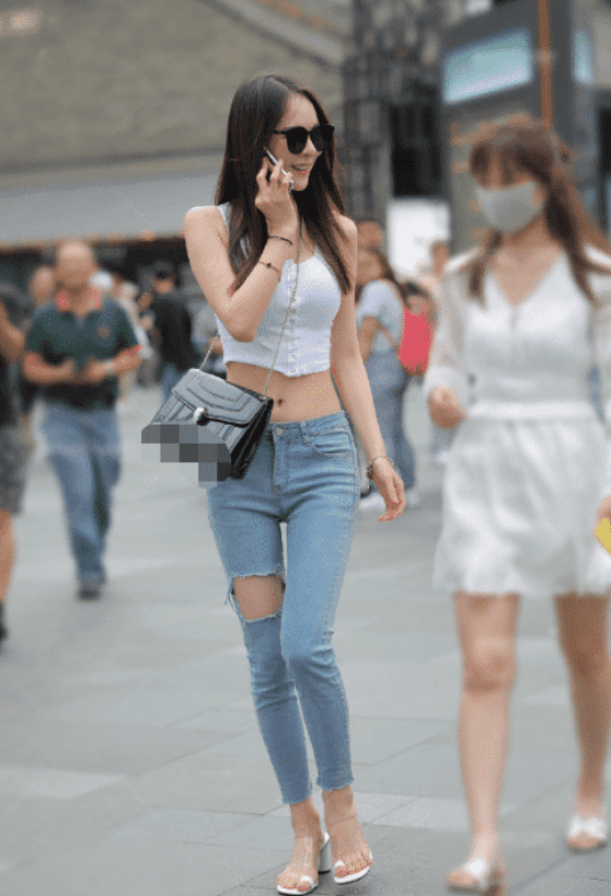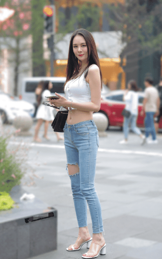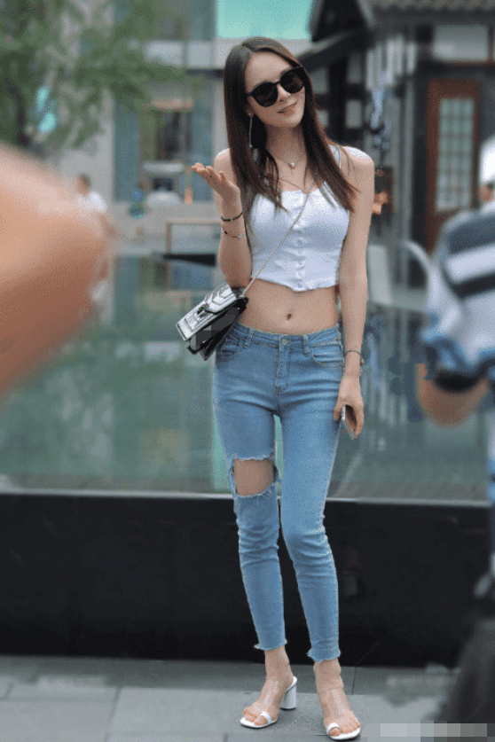牛仔裤的浅蓝色还是比较衬小姐姐的肤色的,漏洞的设计给人一种休闲的感觉,看起来就比较放松,没有那种拘谨的感觉,也是很多人喜欢的类型吧,不过小姐姐的腰真好看,这种A4腰,两天不吃饭可以饿出来吗?你觉得这个美女漂亮吗?欢迎留言评论,谢谢你的浏览。