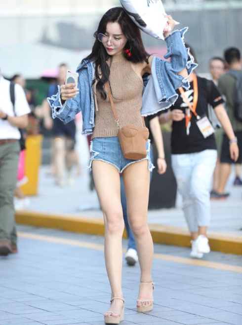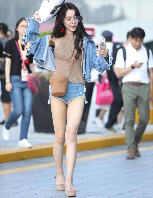小姐姐穿的衣服非常独特。一件卡其色的坎肩,外面搭配着牛仔外套。坎肩的设计下露出了饱满圆润而不臃肿的肩头。胸部挺拔浑圆将前襟撑起,腰身纤细柔韧,不堪一握。下边穿着一条牛仔短裤,短裤包裹着的翘臀富有弹性。