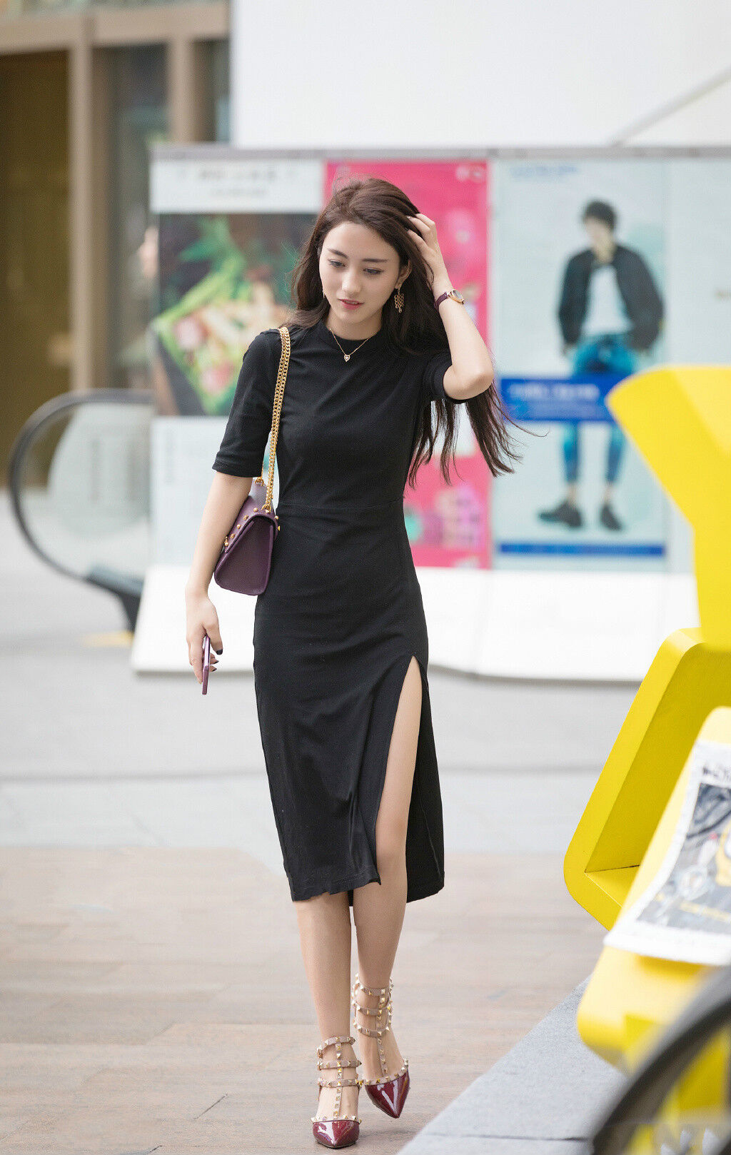 黑色圆领开叉连衣裙,贴身但没有束缚感,丝滑开叉透着一丝小性感,女人味儿十足。我们在选择连衣裙时也要选择这样轮廓上修身型的,利落的线条衬托出女性修长纤细的身姿。这个美眉选择的是红与黑的经典搭配,豆沙色高跟性和豆沙色表带看起来柔媚和黑色的大气形成了鲜明的对比。