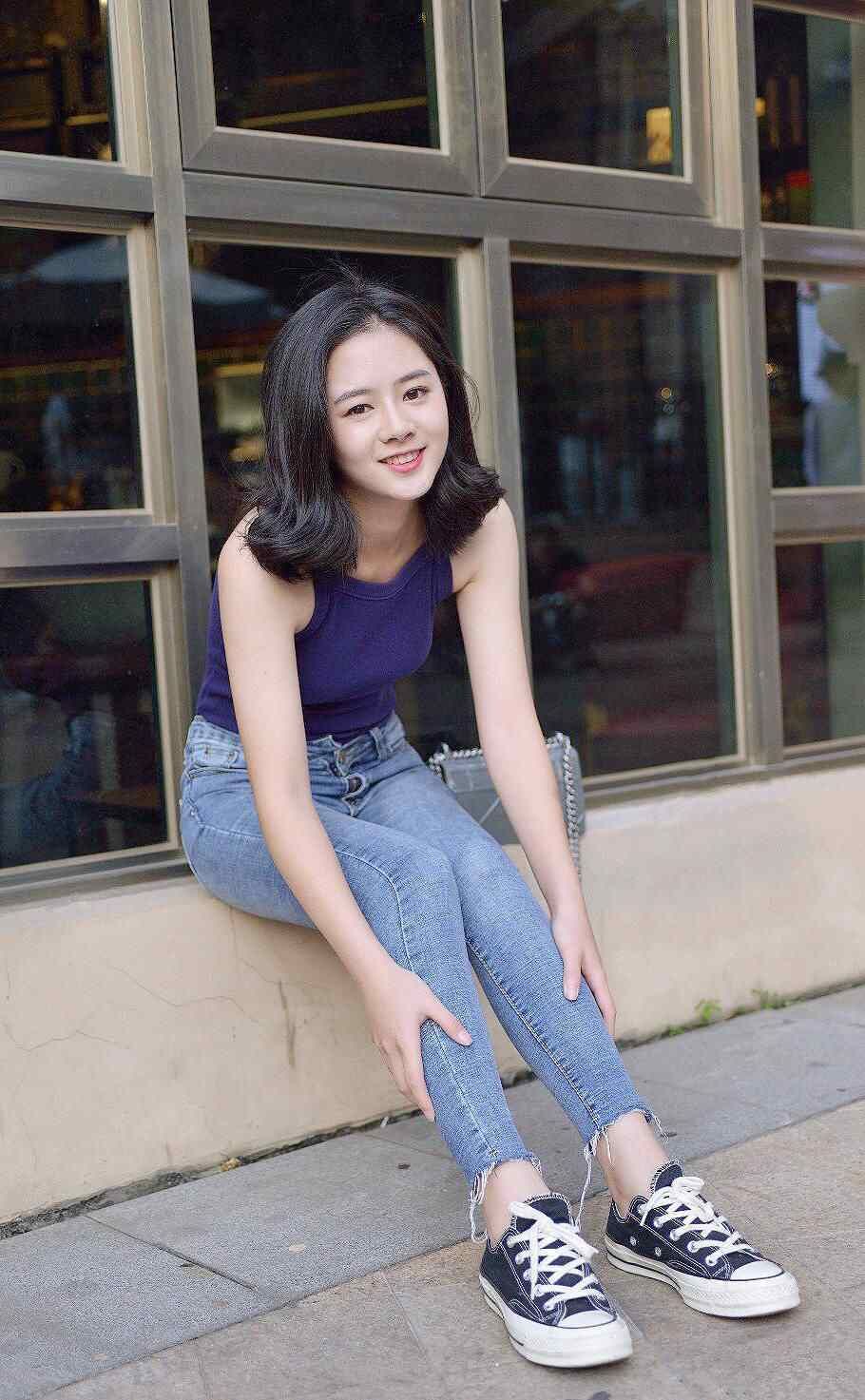 小姐姐与天俱来的美让她有着女神般的气质,有着无需浓妆艳抹,只需轻施粉黛。她的美让小姐姐具有宽广的穿着打扮的空间,今天小姐姐独具匠心的将蓝色打底衣外穿,更是将小姐姐的白色细腻肌肤亮相于众人面前,一件灰色长款牛仔裤,对于小姐姐女神般的气质而言,简单就是她的一种时尚,只是简简单单的一件牛仔裤配合紧吊带露肩上衣,就能整体的展现和升华小姐姐的女神气质,一双普普通通的深蓝色帆布鞋,整体的穿着朴素简单又随意。
