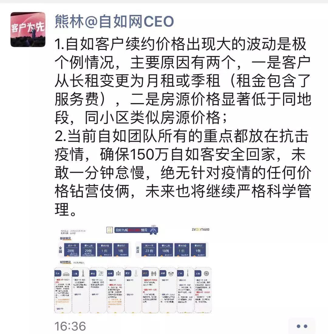 2月10日,自如CEO熊林在朋友圈中作出回应,自如客户续约价格出现大的波动是极个例情况。对于涨价的主要原因,熊林称,一方面是客户从长租变更为月租或季租(包含了服务费),另一方面是房源价格显著低于同地段、同小区类似房源价格。 同日,有媒体发布的一篇《自如推短续优惠活动,用户:已用优惠,价格实惠》文章中写道,当租客出现2月14日前无法返程、合同到期前无法搬家等情况时,有短续1个月需求的,可在续约前联系自如管家并提供相关证明,管家会协助申请短续优惠。