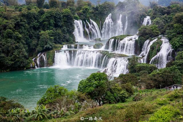 德天跨国瀑布是个巨型阶梯状跌落式瀑布,激流从高处轰隆而下,扬起层层水雾,有时候在阳光的照耀下,还会生出彩虹,特别惊艳。