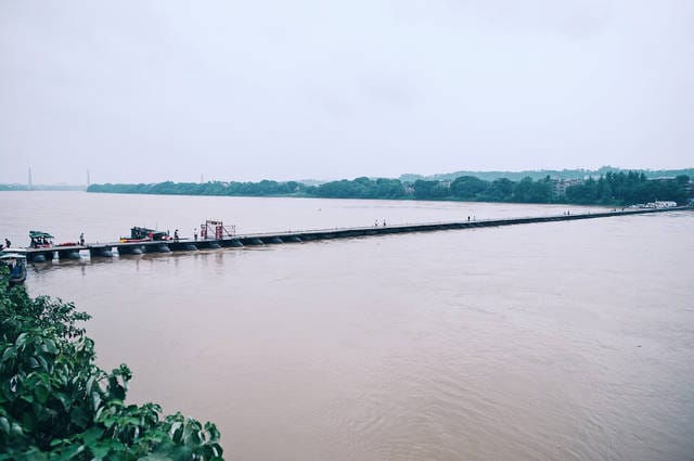 据悉,这座古浮桥始建于宋乾道年间,距今已有800多年的历史,整座浮桥由100多个小船用缆绳相连在一起而成,长400余米,横跨在赣江之上。行人走在上面,可以很清晰地感受到浮桥在水流的冲击下而引起的晃动,好在桥面比较宽阔,走在上面也不会太害怕。