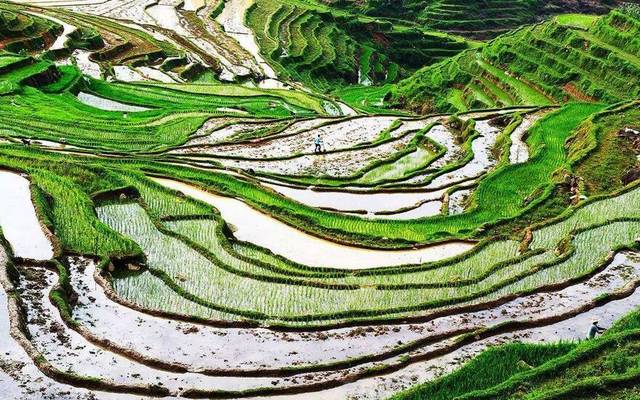 一座座山坡,层层叠叠,交叉错落,连绵起伏。弯弯梯田,似月如弓,蜿蜒伸展,婀娜多姿,神采秀丽,风光旖旎——这就是靖西梯田。