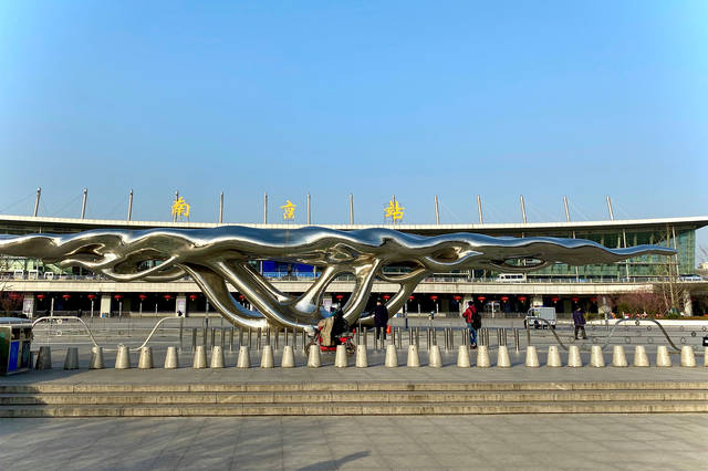 在南京站广场上坐落着一座颇大的雕塑,它的名字叫“梦舟”,为青奥会设计并建成,雕塑材质是不锈钢,人站在前面可以看到自己倒映在雕塑上面,引得不少过往的游人拍照打卡。