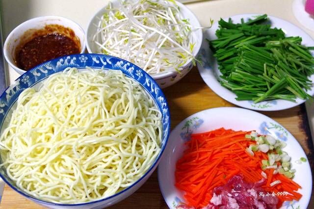 原料:福建食材常见的现成黄色碱面,搭配绿的摆的豆芽,绿的韭菜,红得胡萝卜丝,加上肉丝和面酱。