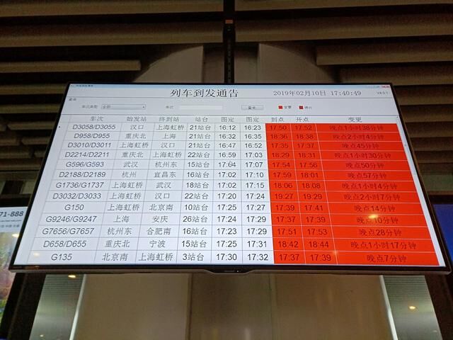 当小编已经到家的时候,在群里发现小伙伴们虽然已经改签到了五点多的火车,但是五点多他们却依然还在南京南火车站坐着。群里传了这样一张图,应对临时的晚点现象做的简易的列车晚点到站图,大面积的红色晚点都超过了一个小时甚至更久,火车站更是人满为患,大家都在眼巴巴地看着时刻表的进展。