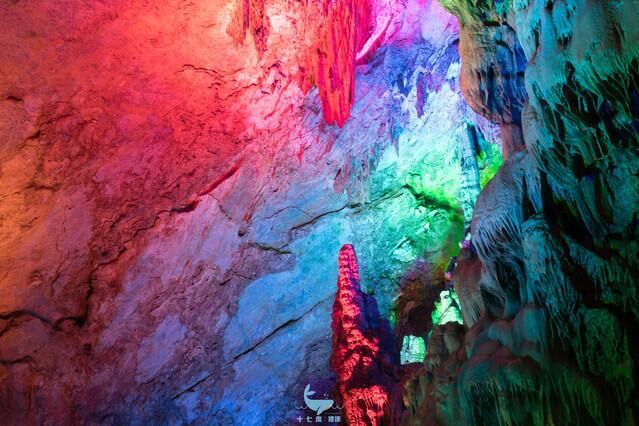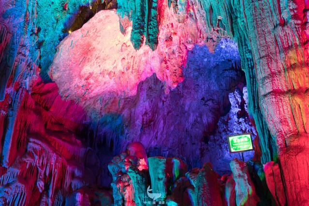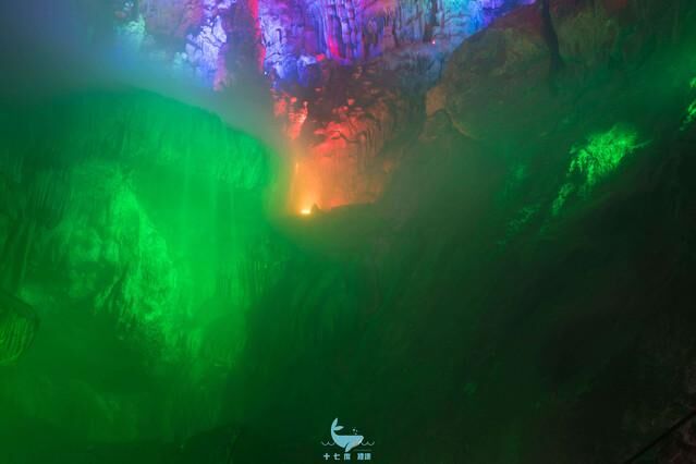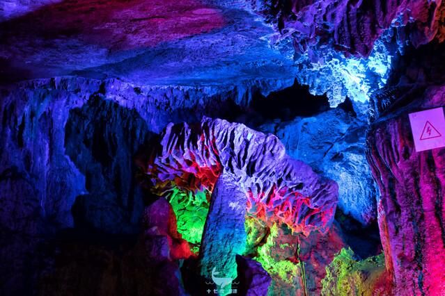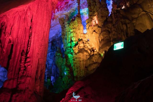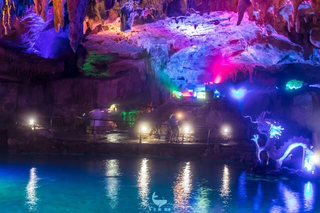 船夫在船尾边掌舵,边跟我们讲解灵泉洞里的神奇奥秘。溶洞里面“三分靠长相,七分靠想象”,“倒挂鳄鱼”、“南极仙翁”等等一些的石林奇观一幅接一幅的展现在我们的眼前。洞里真的是曲径通幽,百转千回,不过熟练的船夫总能熟练地掌握转弯的时机,保障了我们的安全。石林在五彩灯光的照射下更显得熠熠生辉、惟妙惟肖,让人应接不暇。不远处传来稀稀疏疏的声音,抬头一看洞穴上空高高挂着一群蝙蝠,他们是这个洞穴的主人又好似这儿的守护神,不过他们也是在远处观望着我们这群远道而来的朋友,一点都没有伤害我们的意思。船行至终点就是西游记中的一个取景地了,小白龙的龙宫就是在这儿拍摄的。