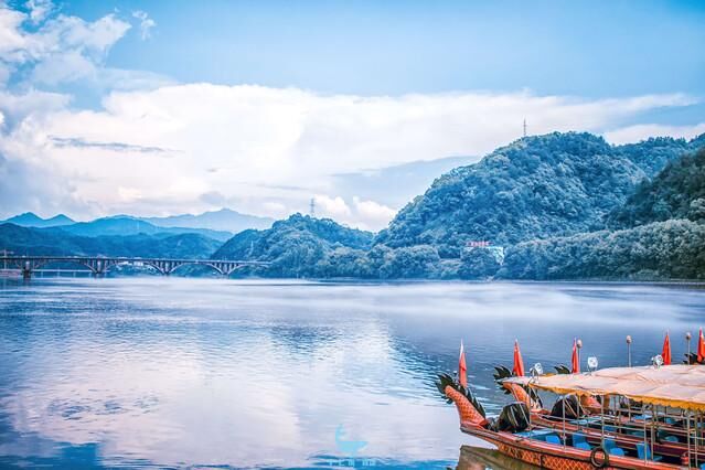 我几乎是用跳的走上了这艘翻云覆雨来见我的江上梦幻蛟龙号,开始了龙舟漂流之旅,细细地欣赏这新安江水之美。一江碧水逶迤而去,如同一条碧绿的翡翠项链环绕着建德这座江城,仙云环绕其上,乘龙舟而上,似有腾云驾雾之感。新安江水质极清,探身下去可以看到水底摇曳的水草,长不大的冷水鱼被我们突然的到来惊醒,一个激灵就跑没影了。